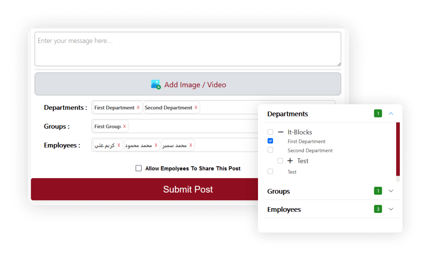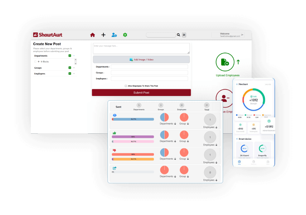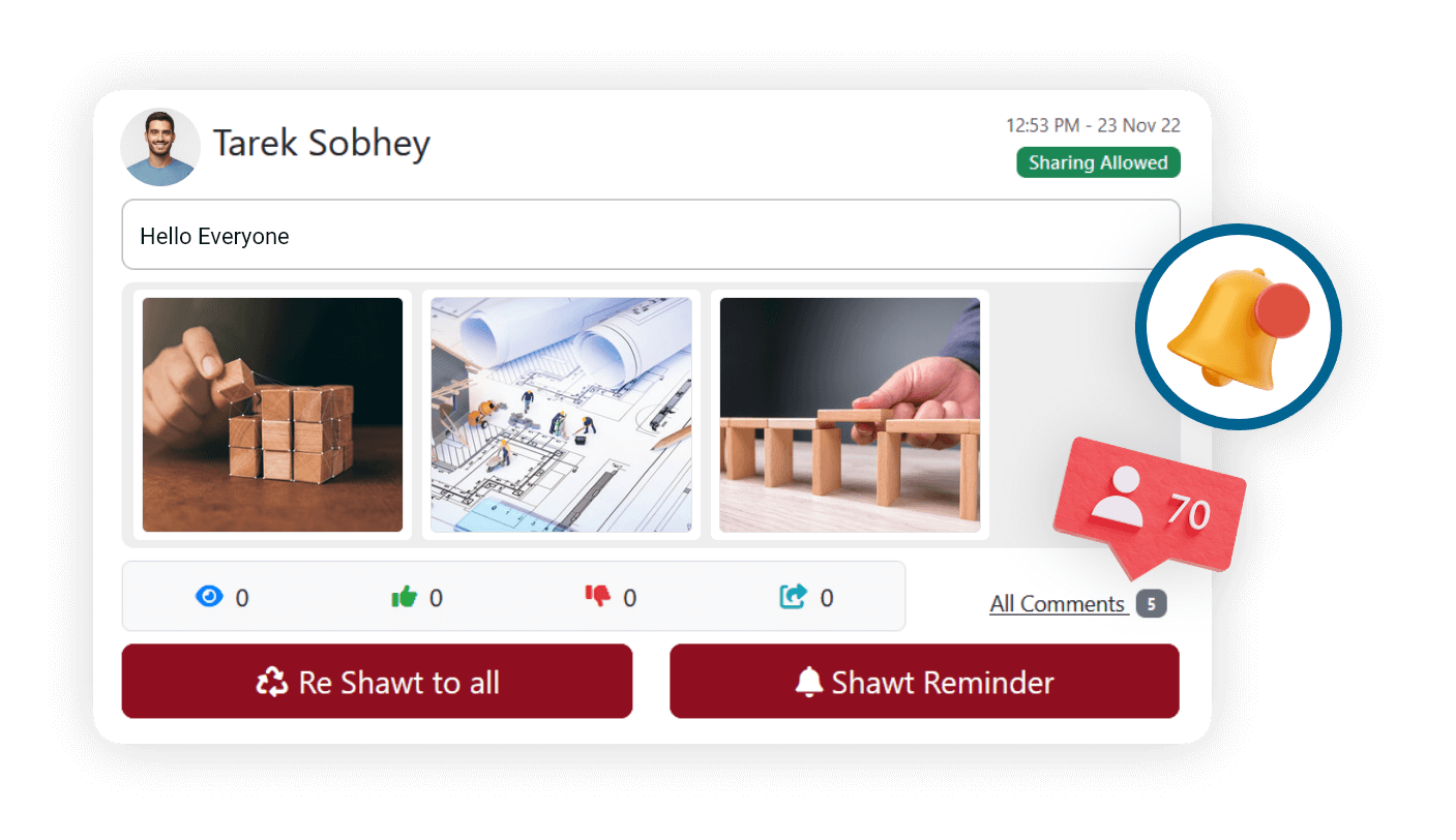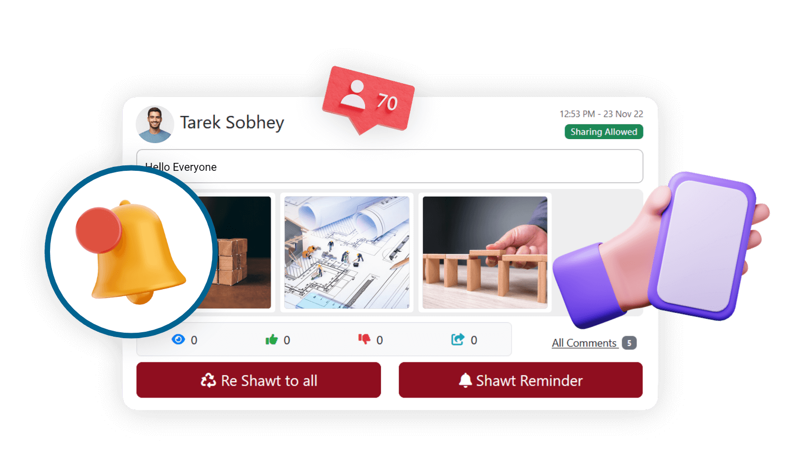 سواء كنت مسئولا عن فريق فى شركة أو نادى أو كومباوند سكنى أو مدرسة أو جامعة أو غيرها، استخدم ShawtAwt لإعلان منشوراتك وأخبارك للمستهدفين من أعضاء فريقك والتأكد من نسبة وصوله إليهم مع قياس مدى متابعتهم لمنشوراتك ومدى تفاعلهم معها سواء كانوا مكتبيين أو عمال أو حتى ربات بيوت